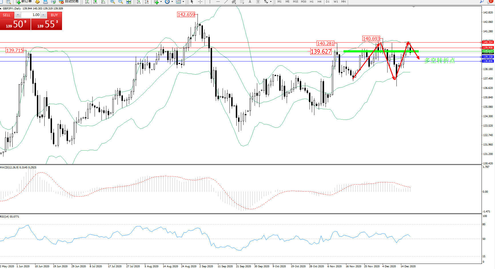 技术点评:多头动力处于布林带指标通道内呈上扬趋势良好,高位抵达140.693位置后遇阻回撤,呈M形态高位双顶之势,有继续下行整理迹象,处于中上轨区间窄幅震荡弱势,MACD指标处于多头区域维持窄幅整理平移中,RSI指标处于多头区域维持整理上扬后有回撤下行态势;