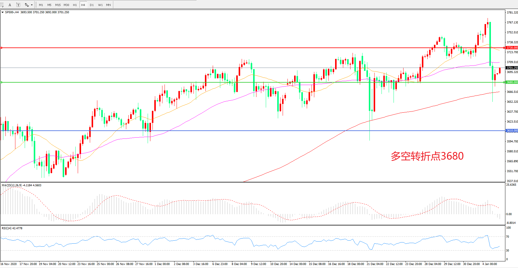周一(1月4日),美国纽约州首现变异病毒,投资者担心防疫措施加强遏制经济复苏,更关注美国佐治亚州的参议院议员的选举结果,市场风险情绪回落,标普500大幅回落,收报3694.25点。衡量美股波动率的“恐慌指数”Cboe VIX盘中涨超28%,收涨逾18%,创2020年10月以来最大单日涨幅,大型科技股盘中集体下跌,明显拖累标普和纳指。