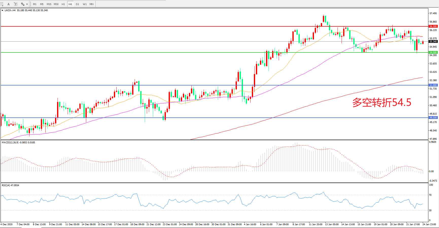 交易策略:  在54.50之上看涨,目标56.50    60.00