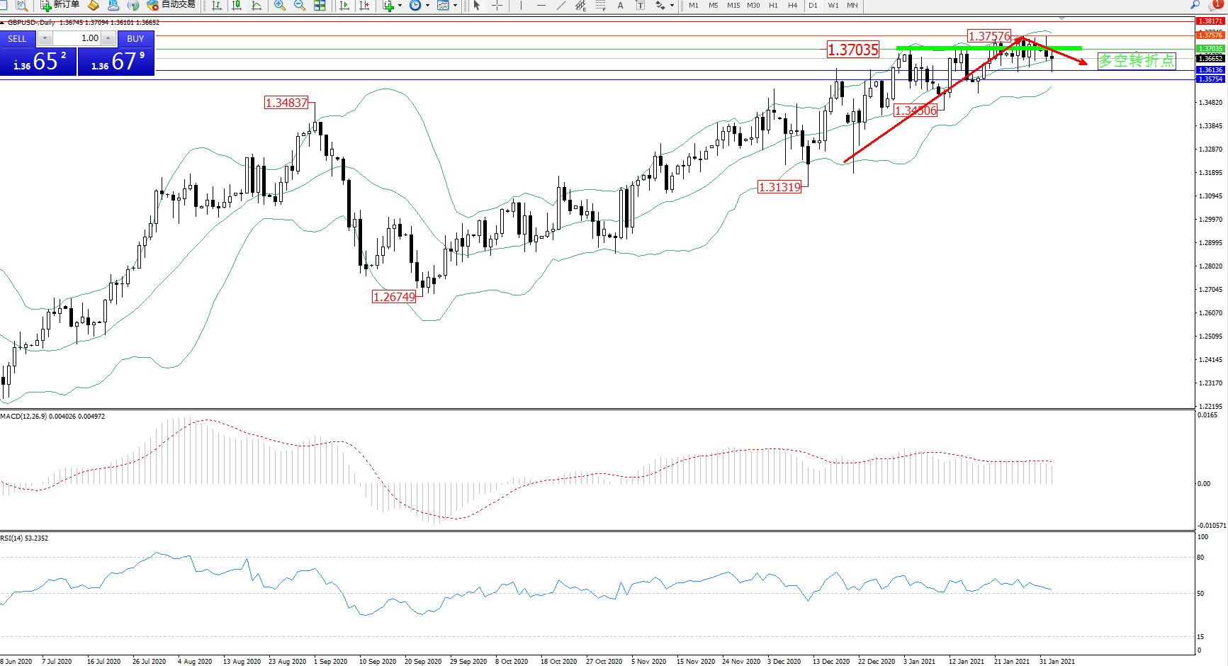 交易策略:1.37035下方看跌,目标1.36136、1.35754