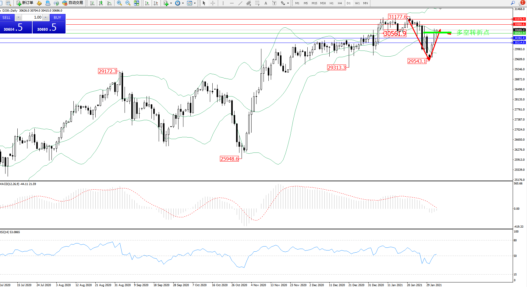技术点评:高位空头动力急速震荡下行至29543位置后得到支撑快速回升,触及布林带指标通道中轨附近节点后有进一步回升态势,布林带指标呈张口走势后开始缓慢收口,关注中轨附近转折点,MACD指标处于处于0轴线下方空头区域维持整理平移中,RSI指标处于50均衡线附近维持震荡后有回升迹象;
