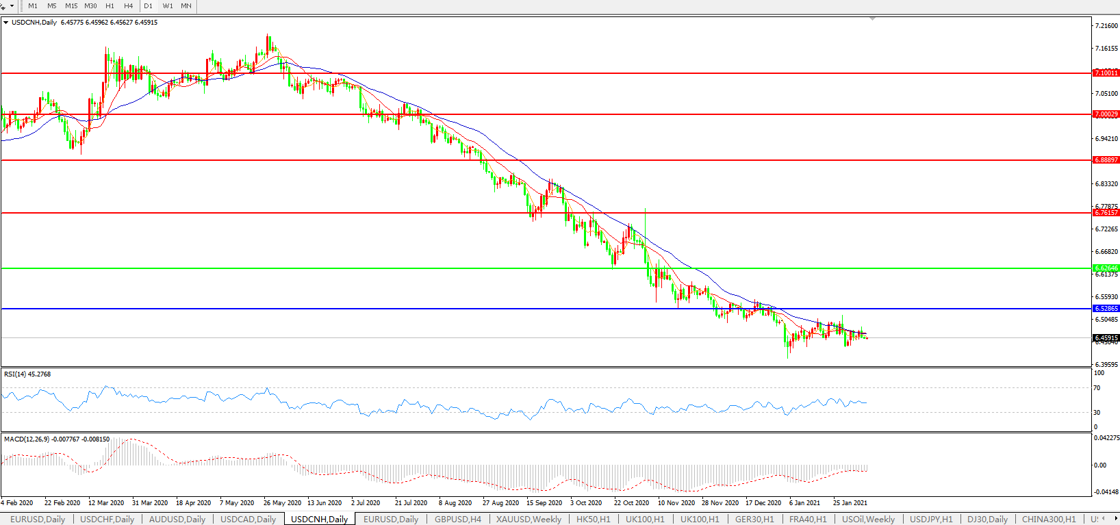 美元兑人民币USDCNH 日线图: