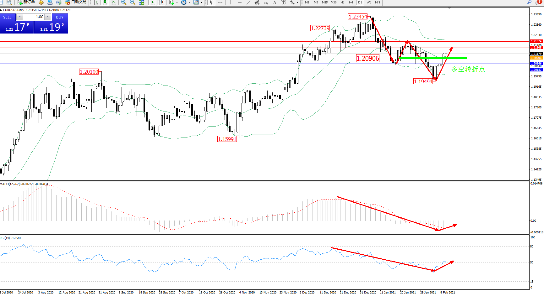 交易策略:1.20906上方看涨,目标1.21544、1.21924