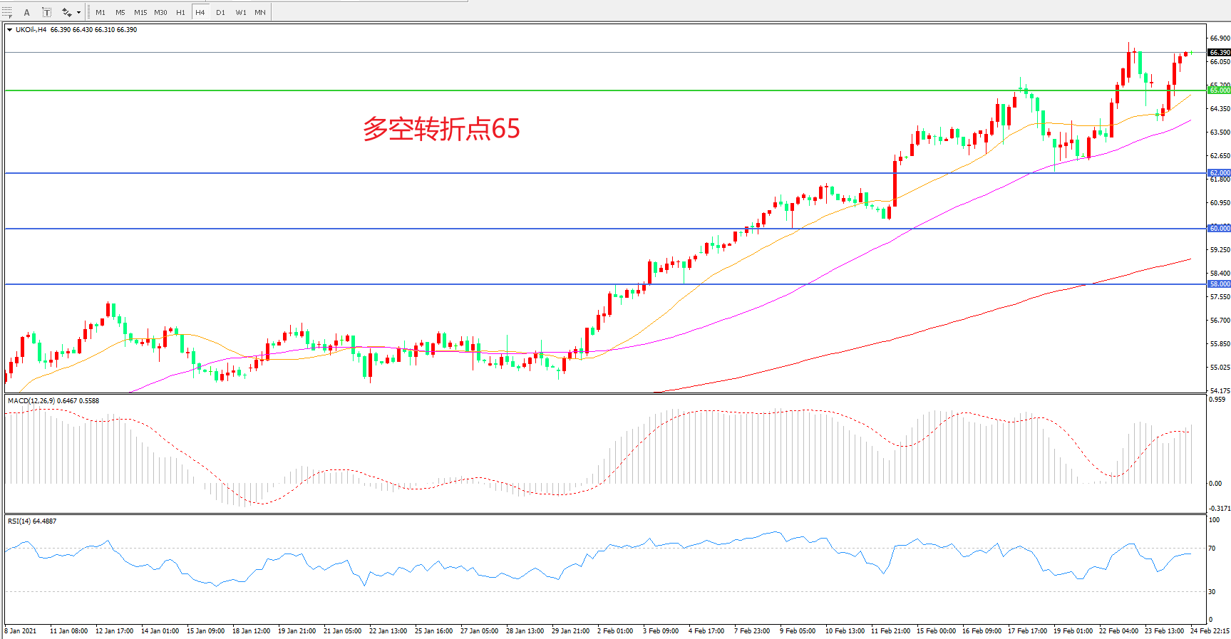4小时图看,油价连续走高后出现调整,但整体依然表现强势,65美元形成下方支撑,均线系统呈多头排列,MACD红柱增加,RSI指标走平,日内震荡上行概率较大。