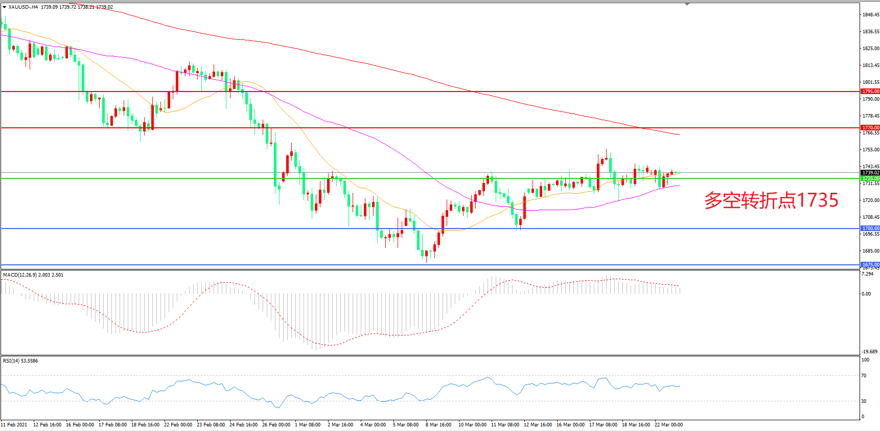 周一(3月22日),10年期美债收益率自高位回落9个基点,市场压力暂时缓和,美元指数持续下行,为金价反弹带来曙光,现货黄金延续窄幅震荡走势,收报1739.61美元/盎司。近两个月以来,亚洲多国民众对疫情的担忧逐渐缓解,而黄金价格锐跌至近九月低谷,多重因素叠加使得亚洲国家黄金需求转旺,实物需求或成为下一阶段市场关注的重心。