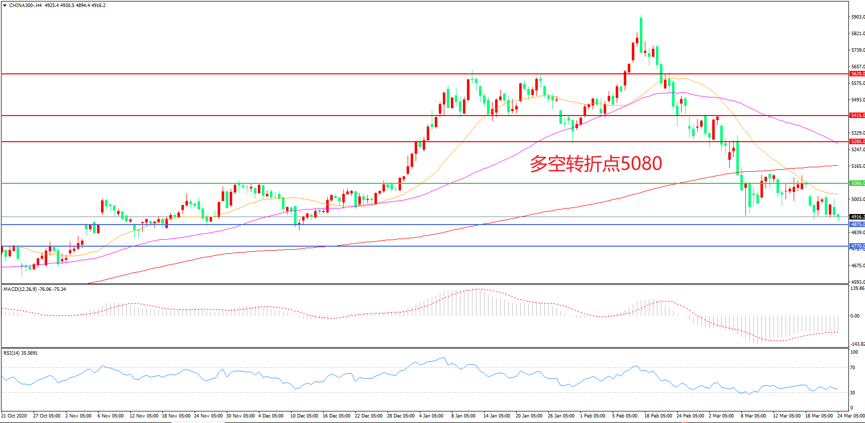 4小时图看,沪深300延续低位震荡形态,整体波幅不大,21周期均线成为上方阻力,4875成为下方支撑,MACD绿柱缩短,RSI指标走平,日内延续震荡概率较大。
