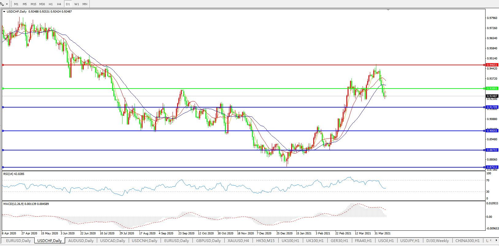 交易策略:0.9300下方看跌,目标0.9170、0.9000