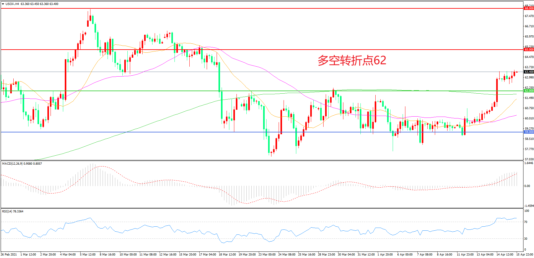 周四(4月15日),美国3月份零售销售数据表现靓丽,大幅好于市场预期,同时公布的上周初请失业金数据也创造了13个月以来的新低。在疫苗的普及以及美国新增确认人数不断下滑的情况下,市场对于未来需求越来越有信心,美国WTI原油延续强势表现,大幅上行后收报63.42美元/桶。不过在疫苗的问题上,阿斯利康疫苗最近问题频频,后续疫苗接种的表现值得市场投资者关注。