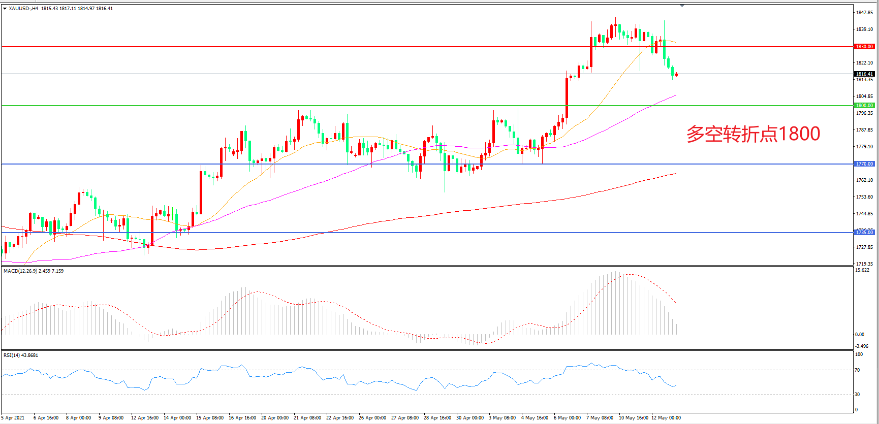 周三(5月12日),美国通胀数据如期公布,4月CPI同比增长4.2%,创2008年9月来新高,核心CPI同比增长3%,创1996年来最大增长。数据公布后,美元指数强势走高,美国基准10年期国债收益率跃升,日内升幅超过7个基点,现货黄金受到打压,收报1815.99美元/盎司。