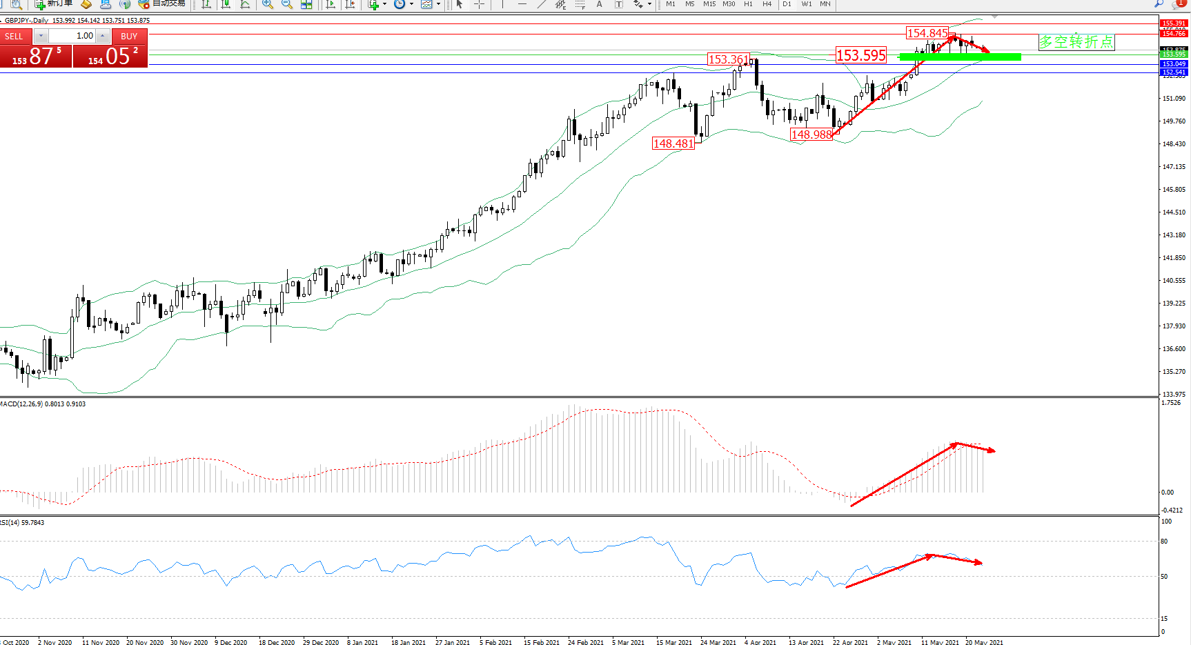 技术点评:多头动力延续布林带指标通道中上轨区间持续震荡上移,高位抵达154.845位置附近遇阻整理回撤,即将触及中轨附近节点,布林带指标呈张口走势后有短暂收口迹象,MACD指标处于多头区域弱势整理徘徊,RSI指标处于多头区域高位平缓下移中;
