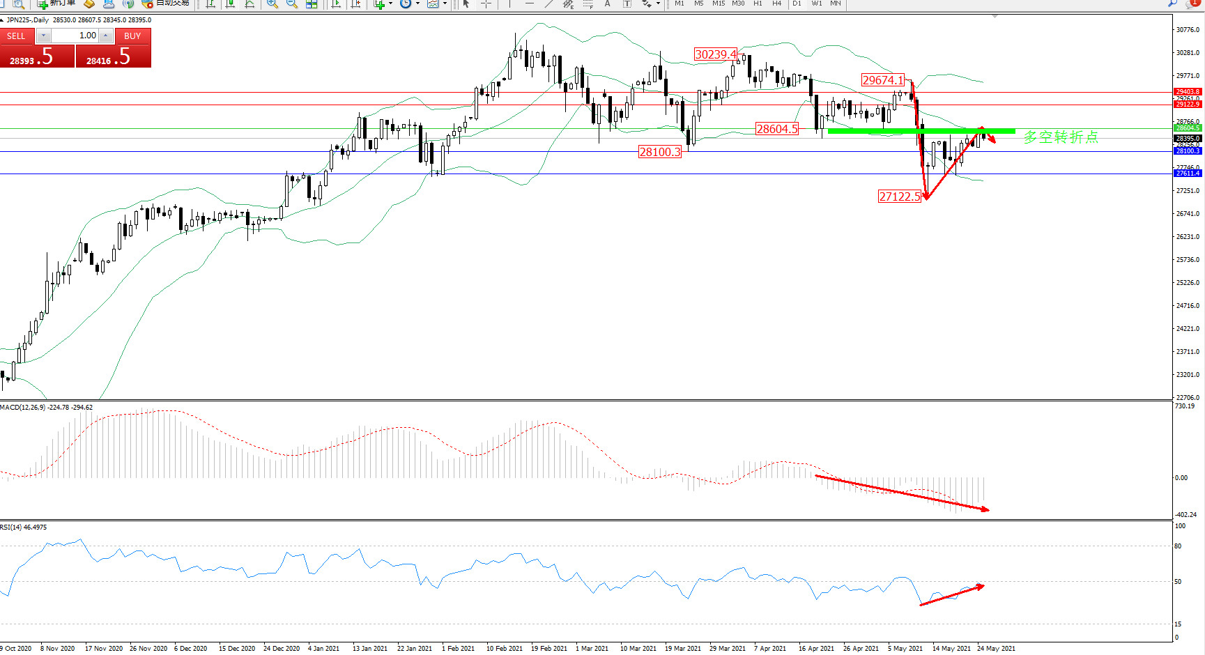 日经225指数5月25日(周二)收盘上涨183.39点,涨幅0.65%,报28548.00点。日本首相菅义伟:将坚持承诺,实现基本收支盈余。下个月将公布政府的财政蓝图。政府将努力使得对日本的投资在2023年提高到80万亿日元,是目前水平的两倍。日本方面正在考虑向贫困家庭发放30万日元的救济金。政府提出的新资金规模将在500亿日元左右,将由本财年的预算提供资金。日本东京新增542例新冠肺炎确诊病例,单日确诊病例7天均值为611例。