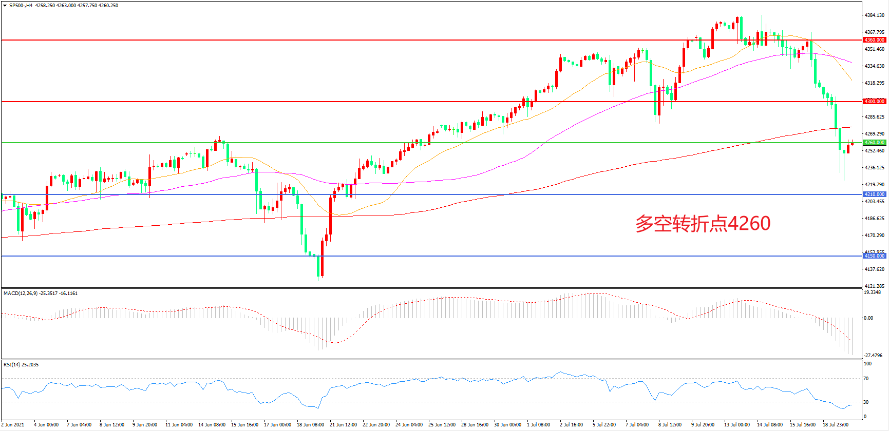 周一(7月19日),由于市场普遍怀疑新冠Delta变种病毒的爆发会延缓全球经济复苏势头,恐慌情绪骤然升温,投资者进入避险模式,标普500遭受重挫,11板块全部下跌,大幅下行后收报4258.75点。本周将迎来繁忙的企业财报周,标普 76 家成分股将公布季度财报,如果企业财报显示经济有放缓迹象,悲观情绪将导致市场进一步下挫。