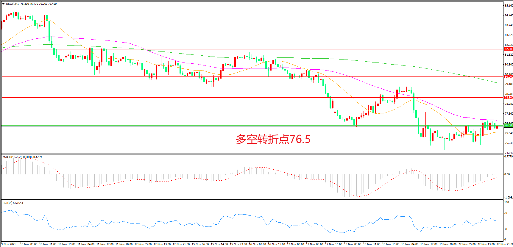 交易策略:在76.50之下看跌,目标74.00               72.00