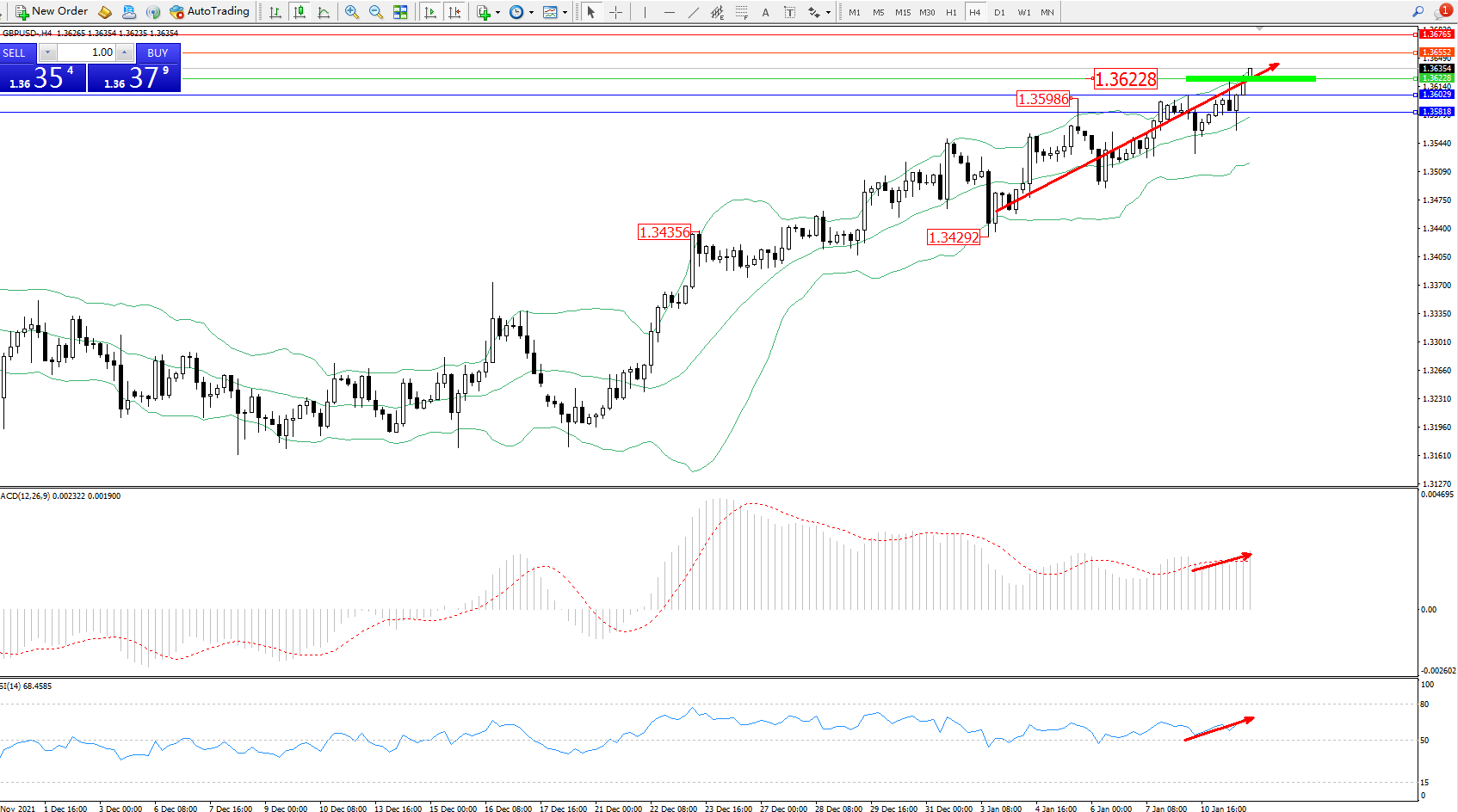 交易策略:1.36228上方看涨,目标1.36552、1.36765