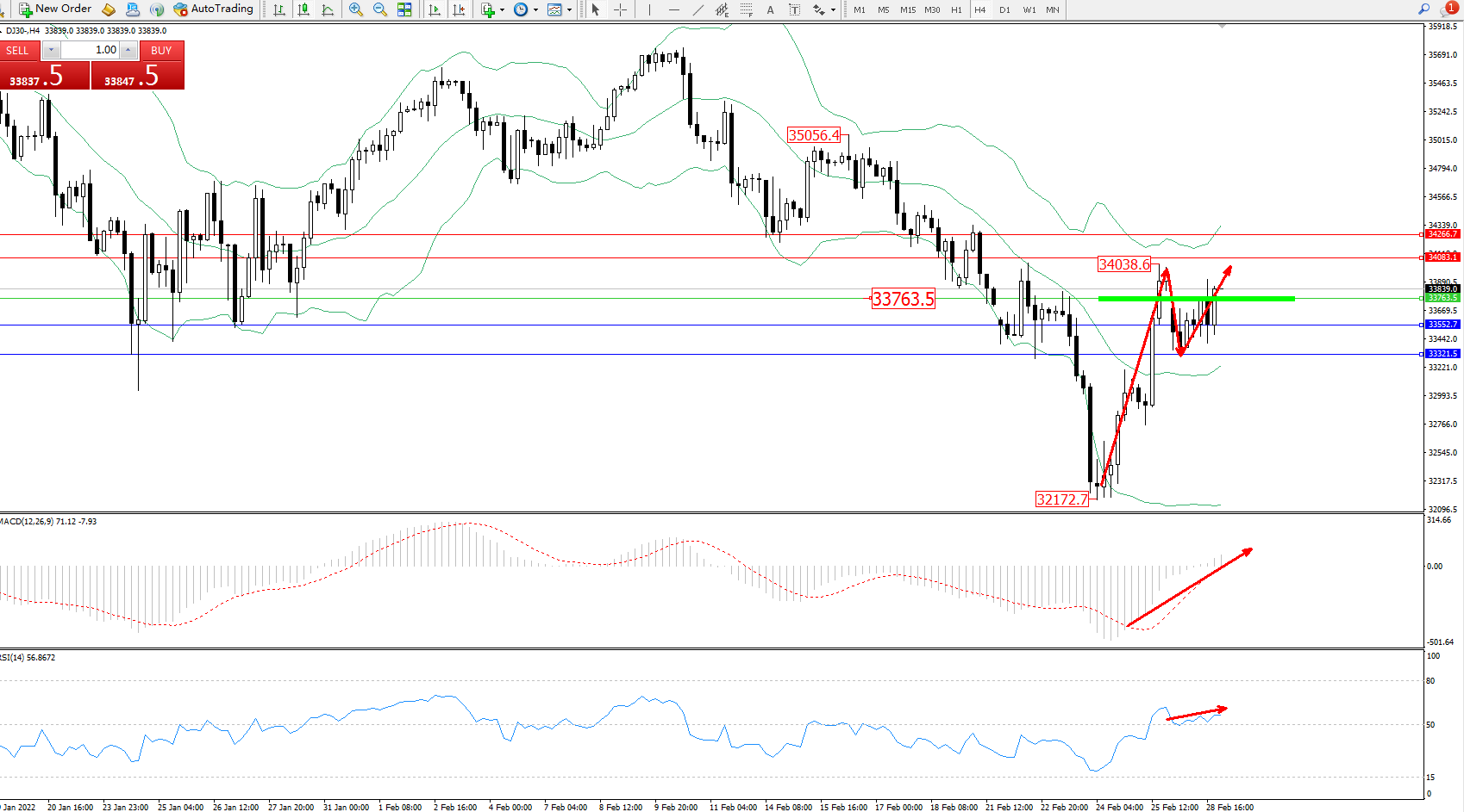 交易策略:33763上方看涨,目标34083、34266