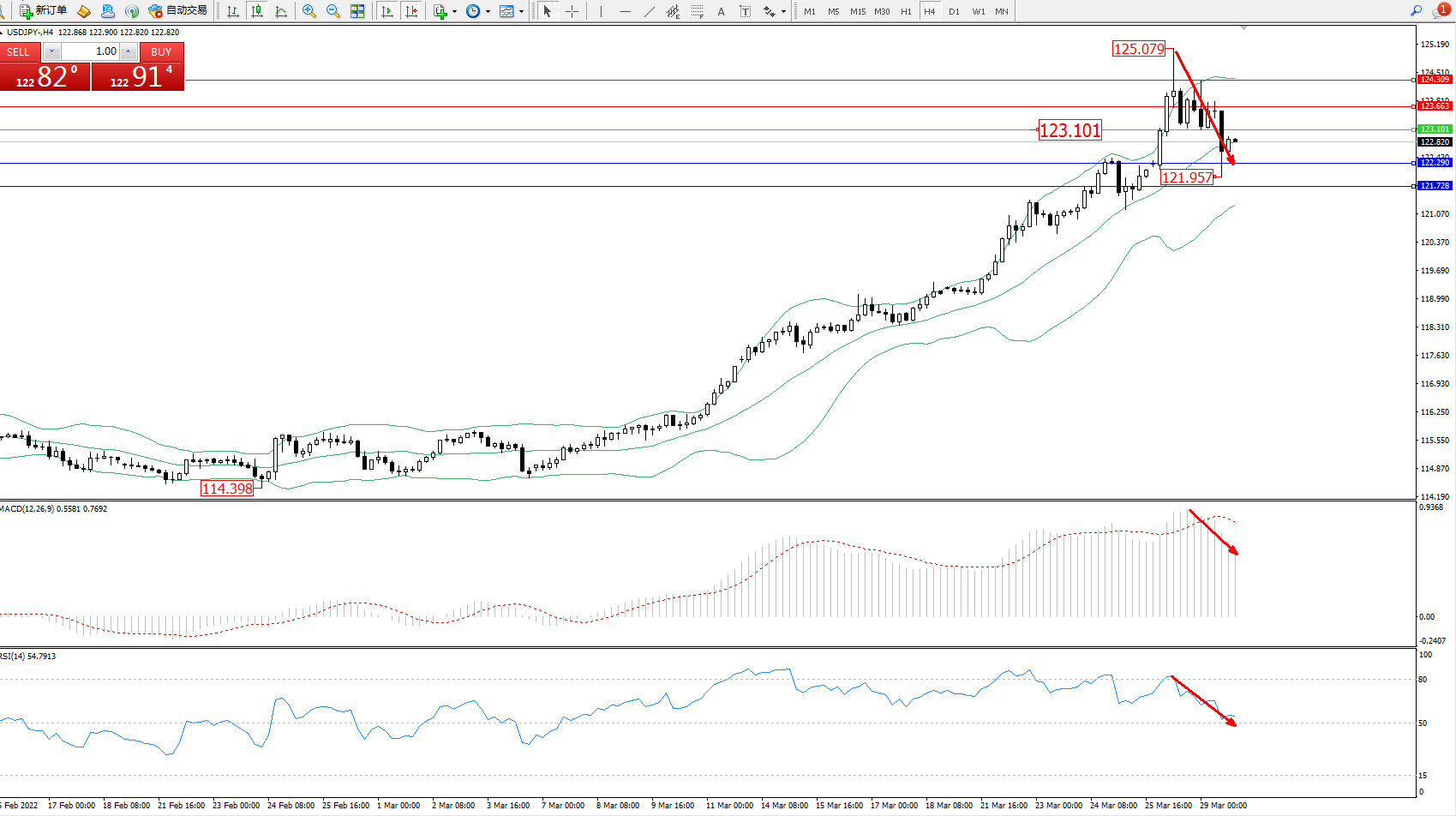 技术点评:多头动力延续布林带指标通道中上轨区间持续震荡上扬,高位抵达125.079位置节点后遇阻开始反转下行,短期空头动力开始伺机入场,抵达121.957位置节点后纠结于布林带指标中轨附近节点开始徘徊,布林带指标呈上行趋势走势后高位有收口迹象,MACD指标处于多头区域高位开始缓慢下行,RSI指标处于多头区域维持震荡下行,即将触及50均衡线附近节点;