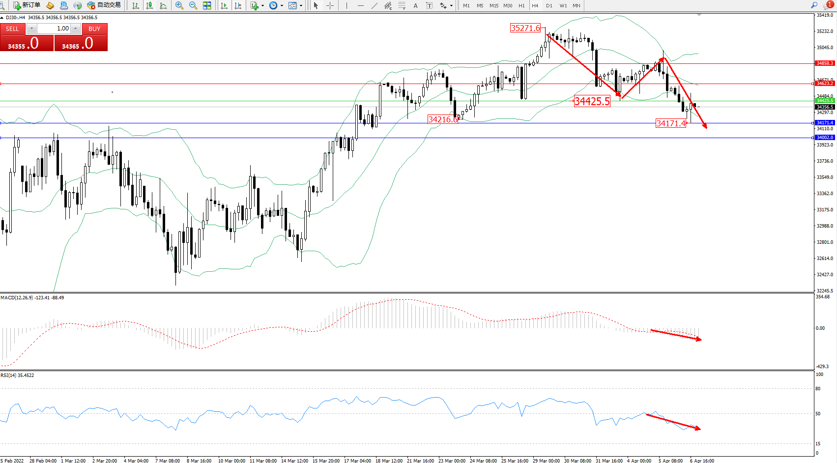 技术点评:空头动力延续布林带指标通道中下轨区间持续震荡下行,低位抵达34171附近节点后震荡,短期空头下行趋势或将延续,布林带指标呈收口走势后开始张口下行,MACD指标处于0轴线下方维持整理平移,RSI指标处于50均衡线下侧维持整理平移;