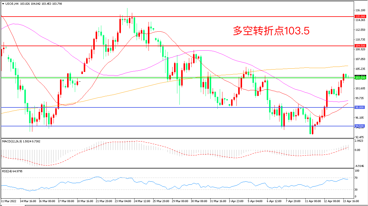 周三(4月13日),根据美国能源信息署公布的数据显示,当周美国EIA原油库存大幅度超预期,但精炼油库存和汽油库存大降加重了市场对供需失衡的担忧,美国WTI原油延续强势表现,收报103.65美元/桶。此前普京表示与乌克兰的和平谈判已陷入“死胡同”,这是迄今为止最强烈的信号,美俄冲突加剧对油市多头形成了信心支撑。