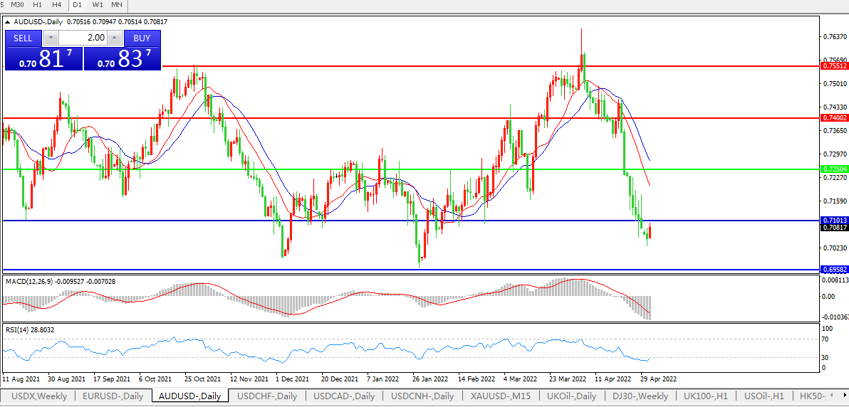 技术面简析:日图均线呈空头排列,汇价止跌后小幅反弹,MACD运行于0轴下且量能持续放量,RSI持续低迷,预计汇价大概率将进一步下行。