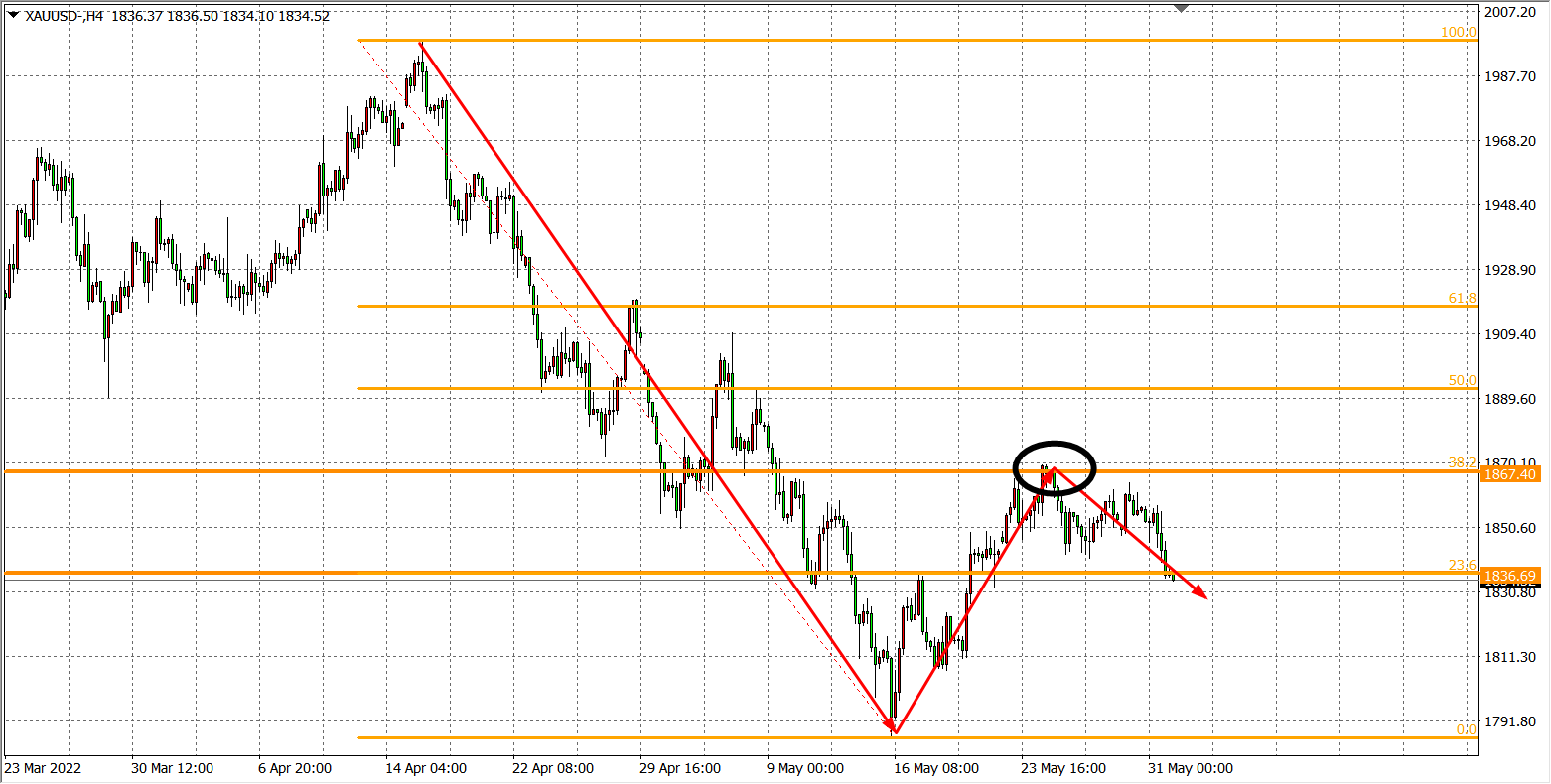 4小时图看,现货黄金在1867美元受阻明显,该位是前一波1998-1787的下跌黄金分割39.2%的位置,为空头弱防守位,金价在此受此回落说明多头反弹力度并不强,后市大概率仍延续震荡下跌为主。