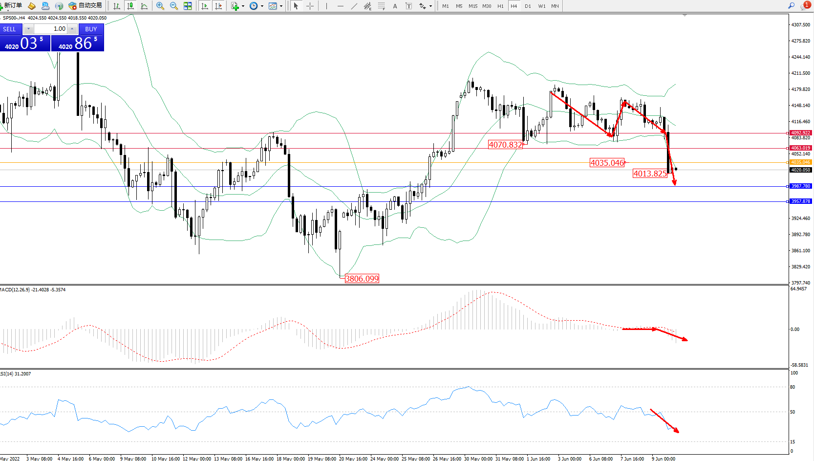 技术点评:长时间维持宽幅震荡后,波幅空间逐渐收窄,空头动力伺机入场,急速下挫,低位抵达4013附近节点后整理,短期空头动力有急速下行迹象,布林带指标呈张口走势持续中,MACD指标处于维持在0轴线下方持续震荡下移,RSI指标处于50均衡线下侧维持震荡下行;