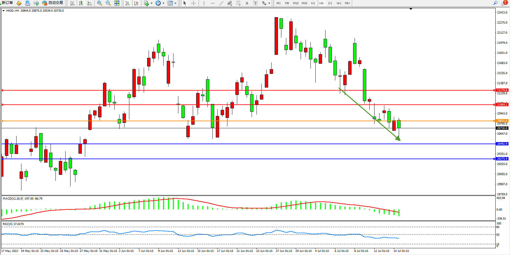 香港恒生指数7月14日(周四)收盘下跌46.74点,跌幅0.22%,报20751.21点;港股早盘冲高,午后现跳水行情,恒生科技指数涨0.89%,盘中一度涨超2%。盘面上,大型科技股多数上涨,烂尾楼风波发酵,银行地产股表现弱势,建材水泥股、餐饮股普跌。
