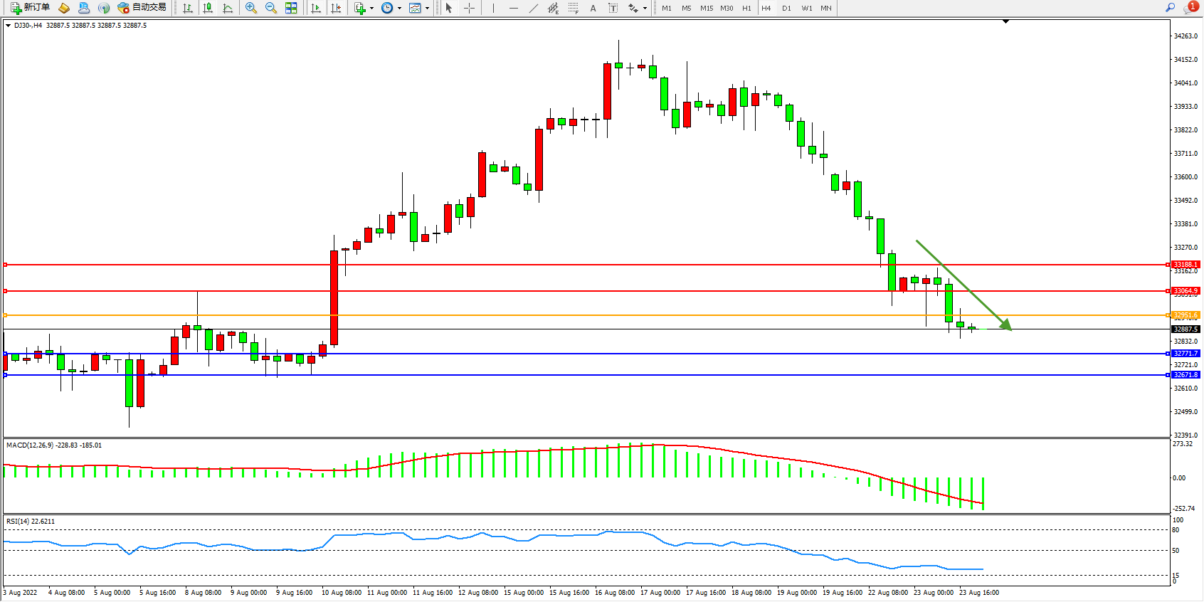 道琼斯指数8月23日(周二)收盘下跌154.02点,跌幅0.47%,报32909.59点;8月标普全球综合采购经理人指数(PMI)初值从7月终值47.7降至45,为2021年5月以来最低。在本周的杰克森霍尔全球央行会议之前,股市在最近几个交易日下跌,预计美联储主席鲍威尔将在周五强调,美联储坚定地致力于消除处于40年高位的通胀。