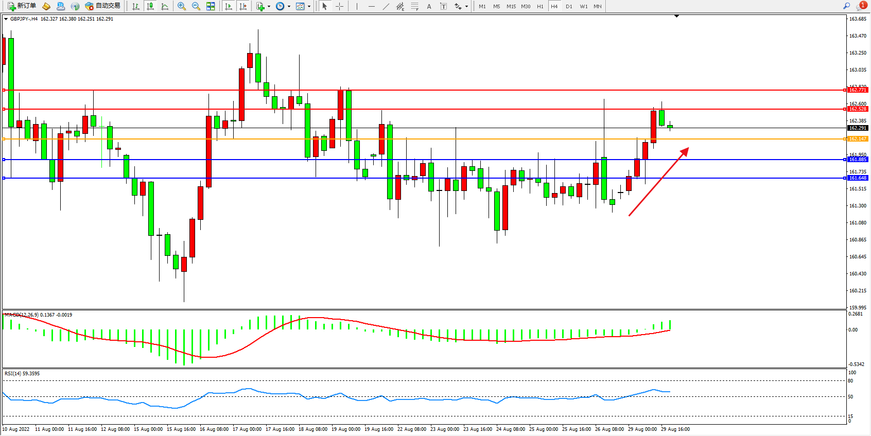英镑兑日圆维持162.291附近震荡,能源危机可能促使英国政府向家庭提供更多的支持,从而导致英国央行进一步加息。英国家庭可能需要政府进一步提供至多650亿英镑的支持,以抵消今年冬天能源账单的上涨。再加上如果英国外交大臣特拉斯成为首相后可能推出的减税,将大大降低经济深度衰退的风险。