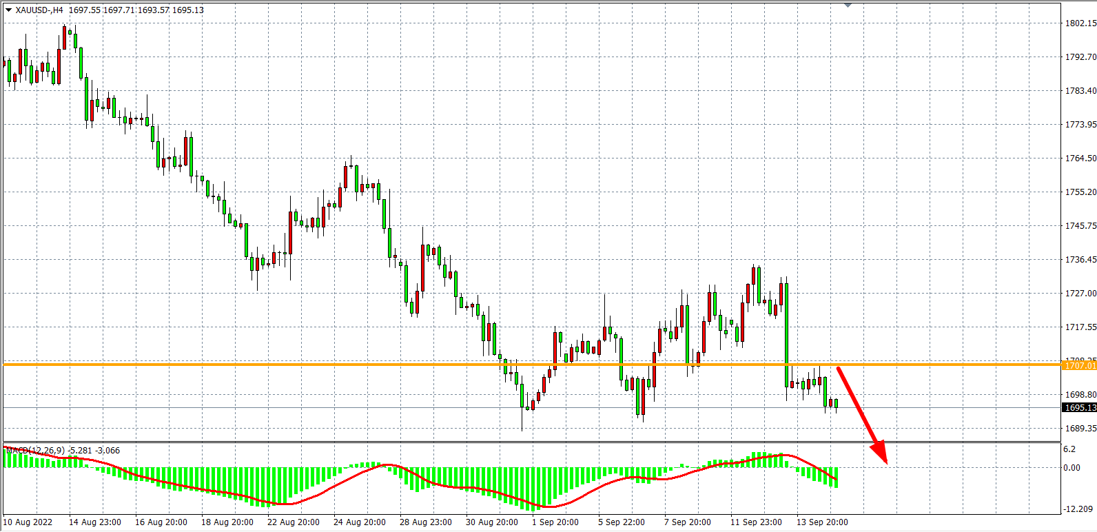 4小时图看,金价小幅休整过后延续跌势,下破1700美元关口,MACD于零轴之下持续放量,显示趋势延续跌势,前期阻力已下移至1707美元附近,日内在该位之下维持看跌,下方目标1688-1675
