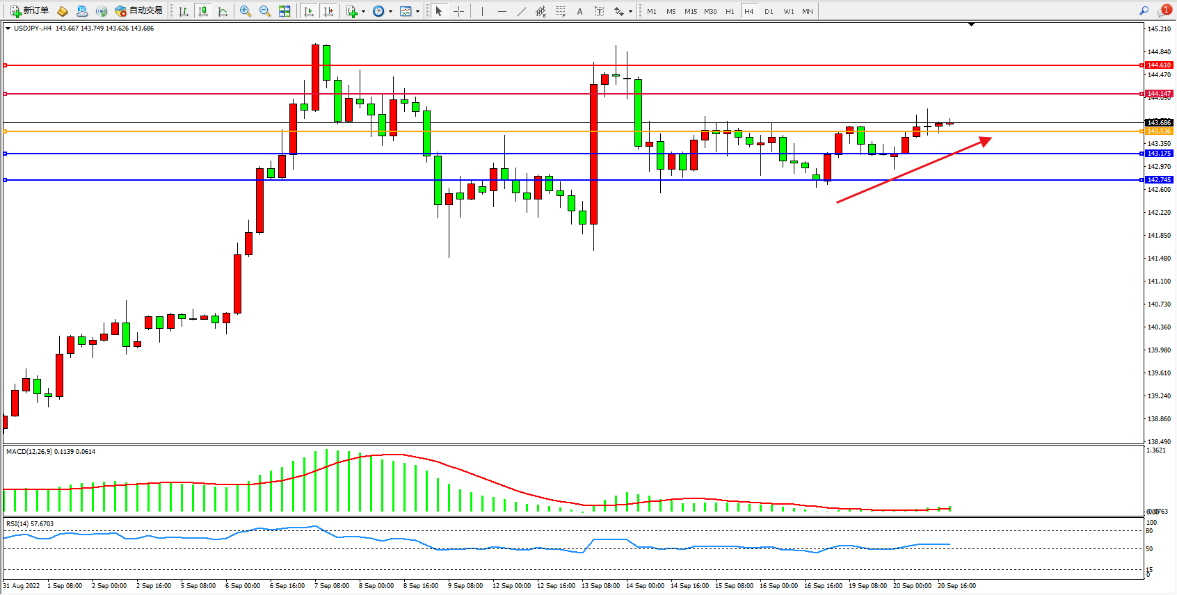 交易策略:143.536上方看涨,目标144.147、144.610