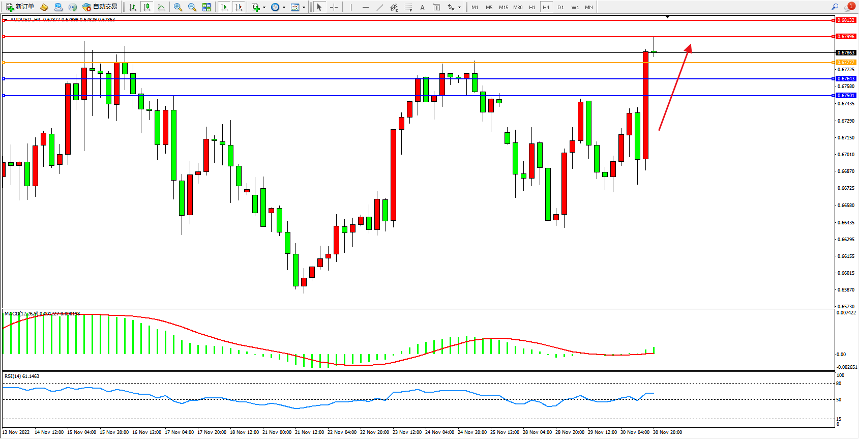 澳元兑美元维持0.67869附近震荡,澳洲统计局数据显示,10月消费者价格指数(CPI)同比上升6.9%,比9月上升7.3%有所放缓。这对澳洲联储来说是个惊喜。为了遏制通胀,该央行已被迫累计升息了275个基点,使指标利率达到2.85%的九年高点。