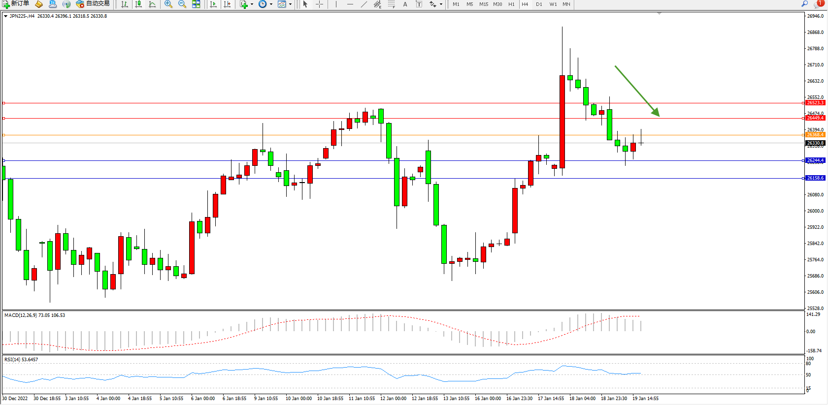 日经225指数1月19日(周四)收盘下跌400.62点,跌幅1.50%,报26390.50点。日本12月贸易逆差收窄,因出口增长相对稳健,而日元的走强和能源价格下跌有助于减少进口支出。日本财务省周四公布的数据显示,日本贸易逆差缩小至1.45万亿日元(合约113亿美元),为五个月来首次跌破2万亿日元。