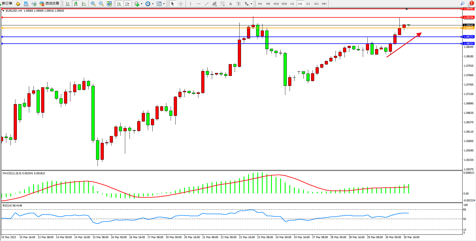4小时图看:高位短期整理上扬,市场看涨情绪涌现,即将突破此前高位节点,MACD指标处于多头区域缓慢上行,RSI指标处于多头区域持续上移;