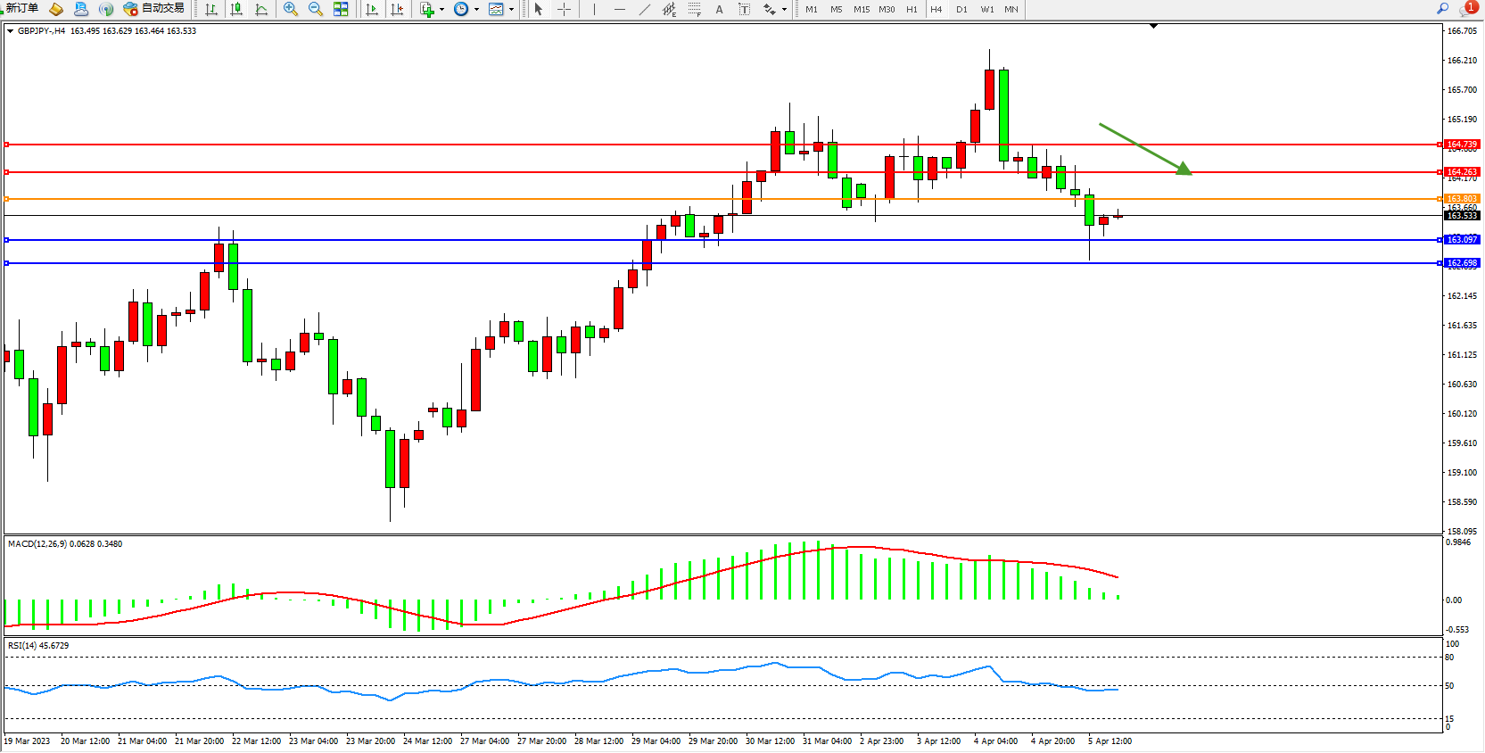 4小时图看:高位空头动力震荡下行,短期跌势持续,市场整体处于偏空头不断向下移动,MACD指标处于多头区域震荡下移至0轴线附近徘徊,RSI指标处于50均衡线下侧弱势整理;