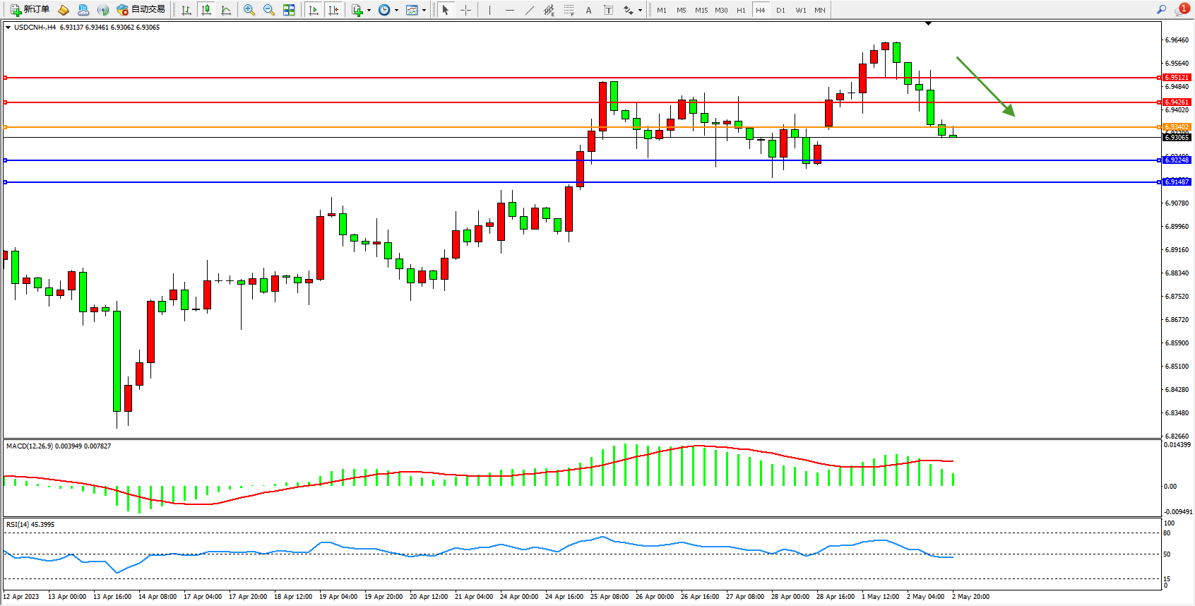 交易策略:6.93420下方看跌,目标6.92248 6.91487