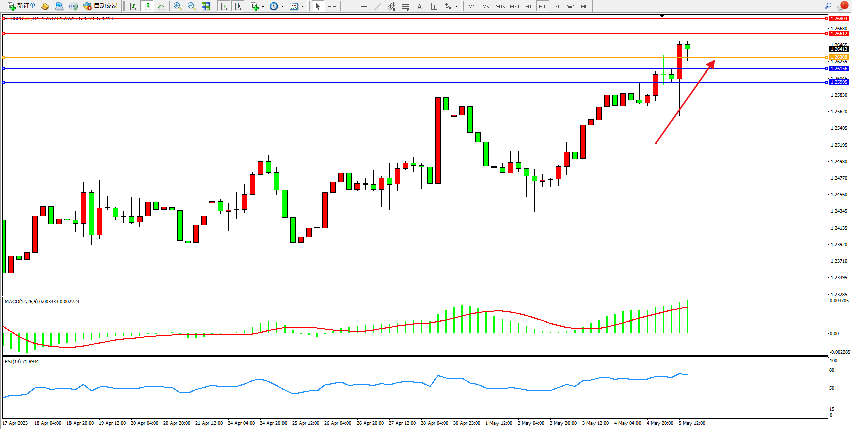 4小时图看:多头动力高位上扬,市场看涨情绪依旧,短期未见有止步迹象,MACD指标处于多头区域不断向上移动中,RSI指标处于多头区域高位整理;
