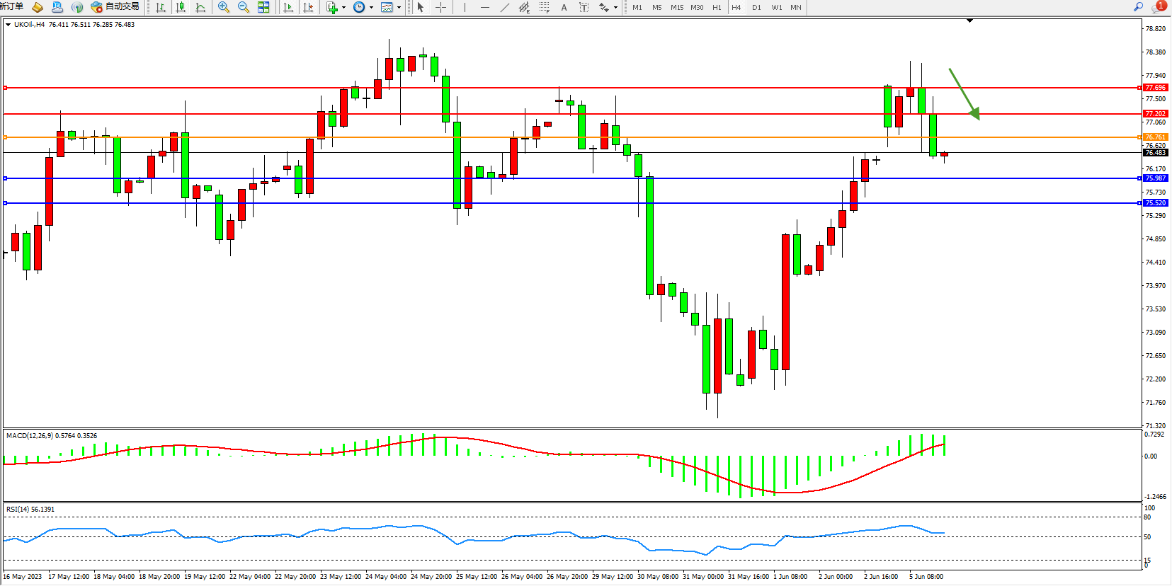 交易策略:76.761下方看跌,目标75.987  75.520