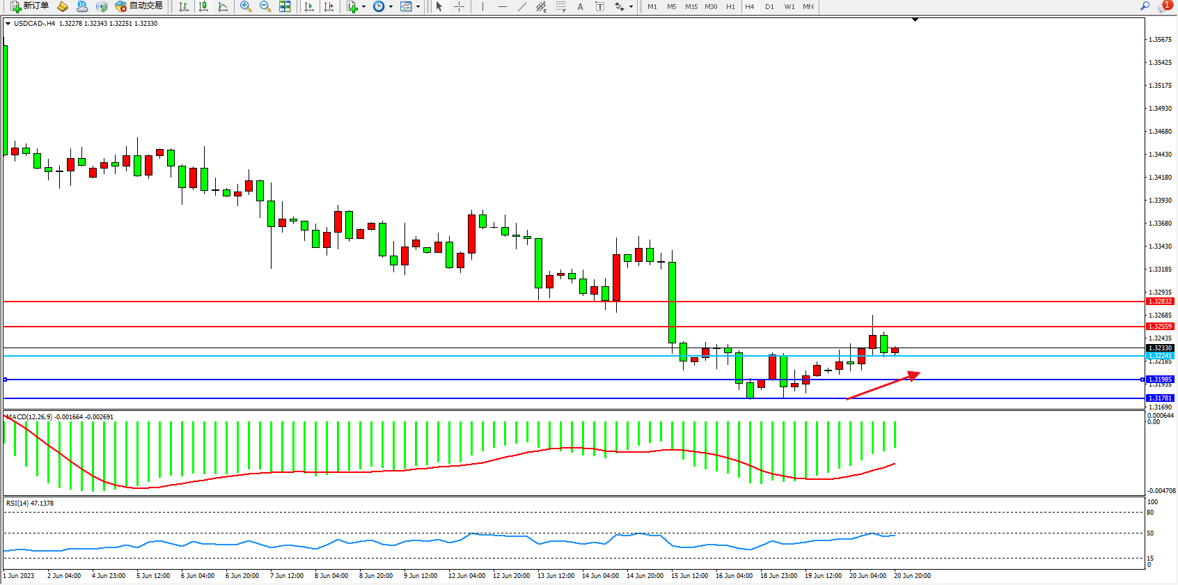 4小时图看:低位多头动力维持震荡上移,市场看涨情绪依旧,市场多头不断上扬,MACD指标维持震荡持续上行,RSI指标处于50均衡线下侧弱势徘徊;