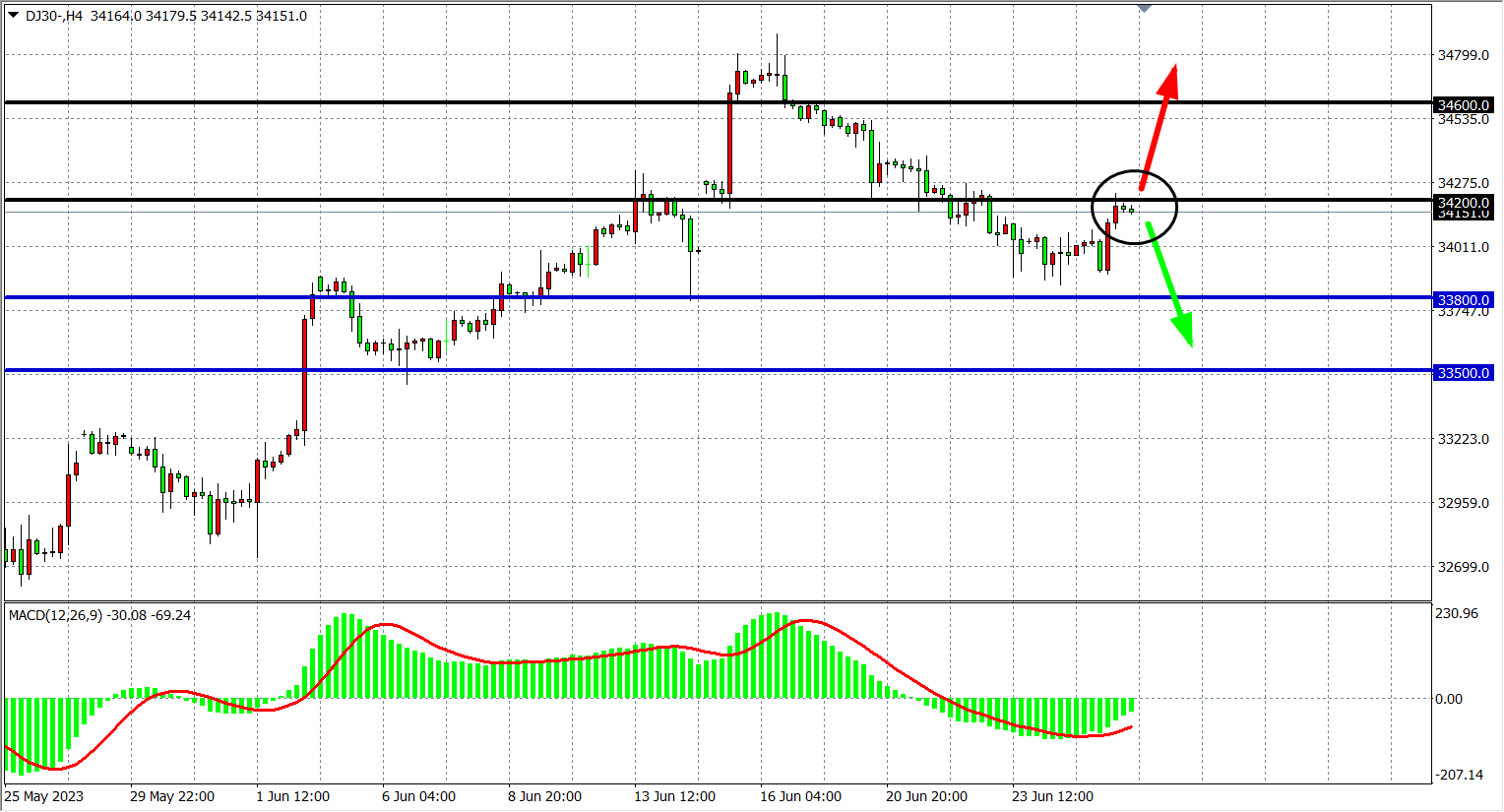 4小时图看,道指在33900一线出现企稳反弹,MACD量能在零轴下缩量即将上穿零轴,短期反弹行情开启,下方支撑33800-33500,上方关注34200,上破可进一步看至34600-35000。
