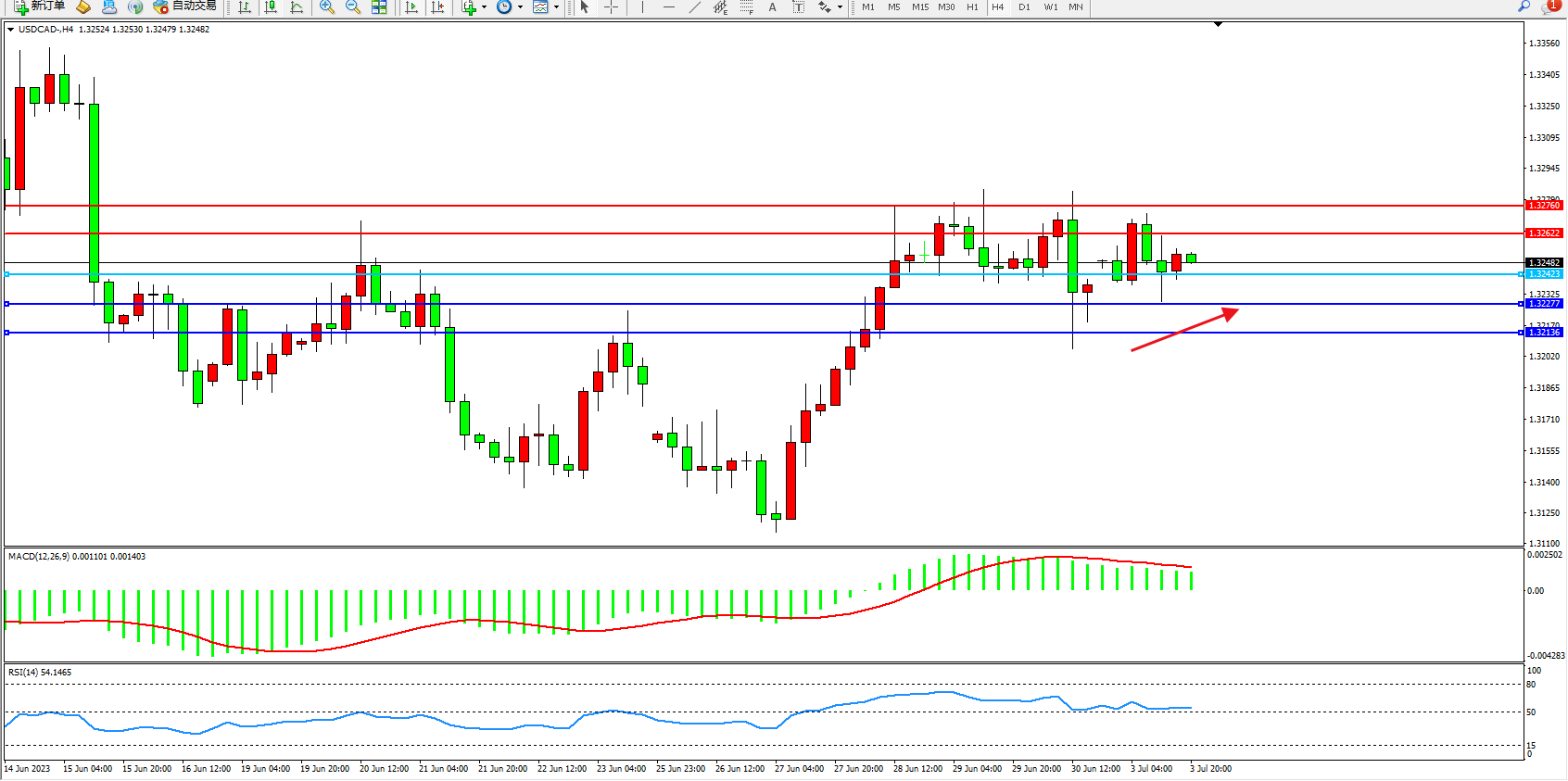 4小时图看:短期高位震荡,市场整体维持区间整理,多空动力均处于焦灼状态,MACD指标处于多头区域维持整理,RSI指标处于50均衡线上側徘徊;
