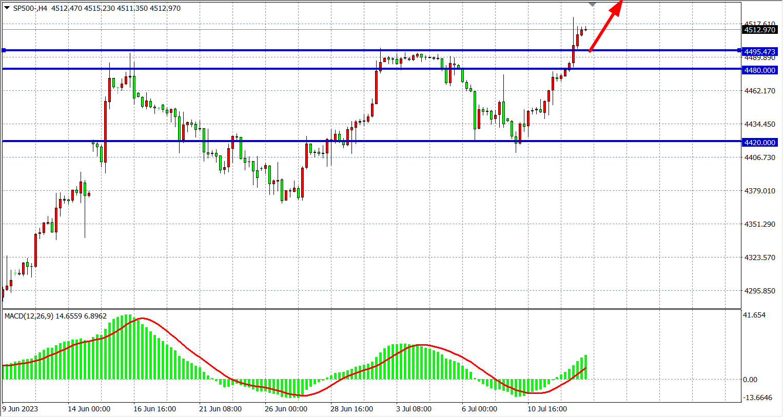 4小时图看,标普上破前高4495,MACD量能在零轴上放量,趋势延续上涨,当前支撑上移至4480-4495,上方阻力4530-4580。