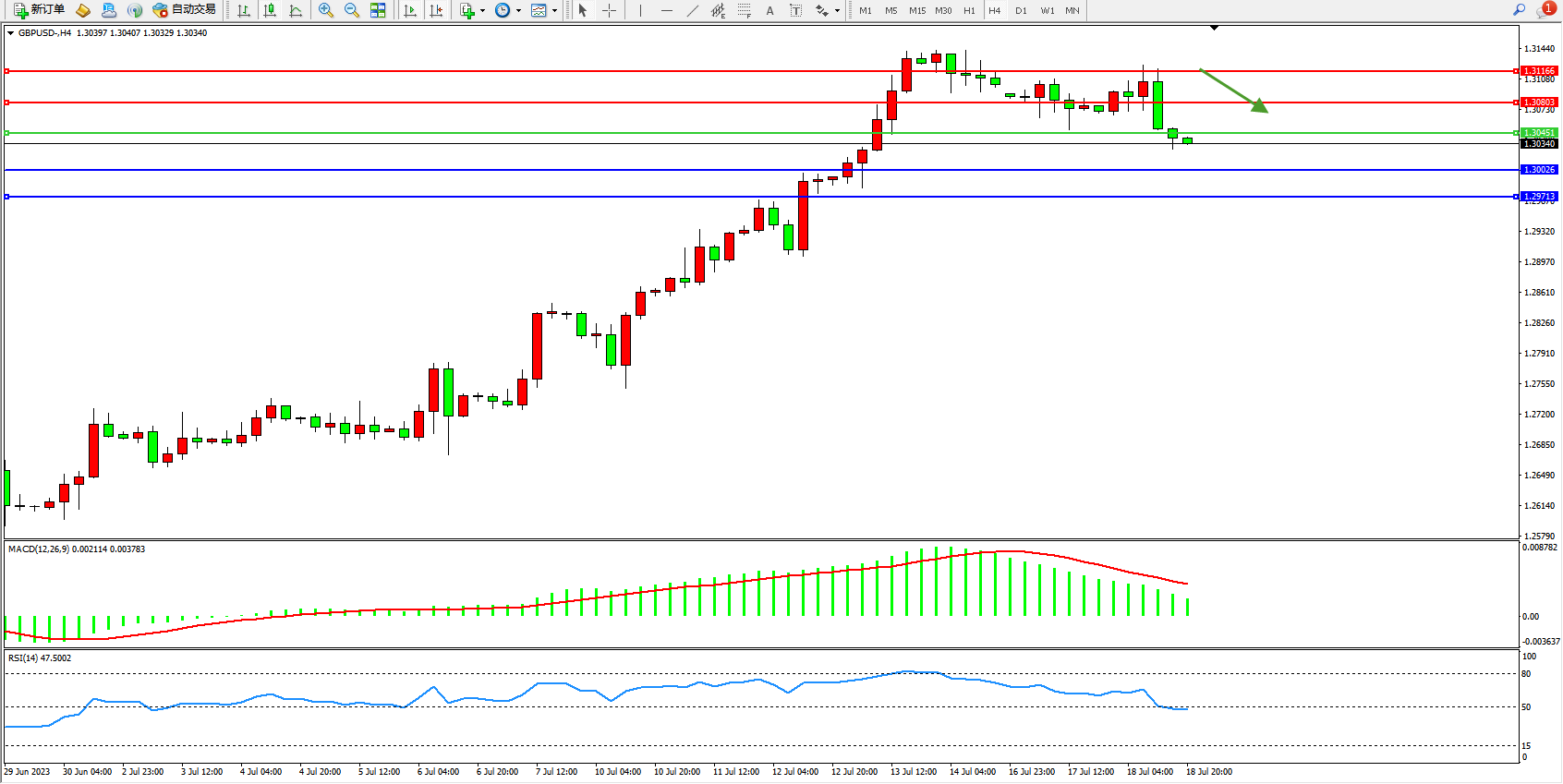 4小时图看:高位空头动力逐渐向下移动,短期跌势或将延续,市场整体空头情绪笼罩,MACD指标处于多头区域震荡向下移动,RSI指标震荡下行至50均衡线下侧徘徊;