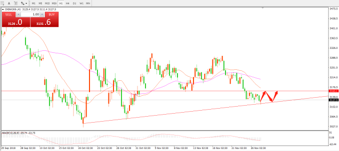 11月27日 两市小幅高开,开盘之后随即回落资金出逃意愿增强,整体来看,市场处于存量资金博弈成交额显著缩小,午后两市集体下挫截止收盘CHINA300报价3125,当日下跌13个点。