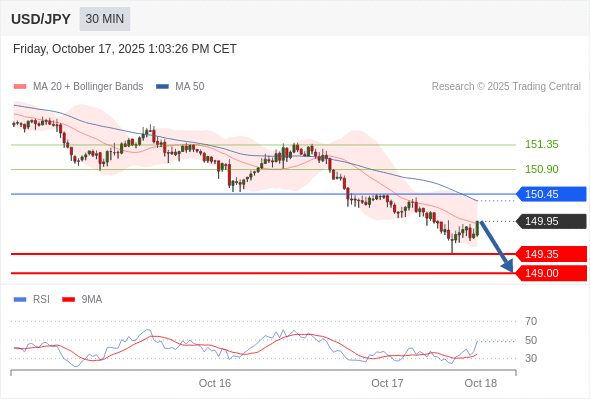 在 150.45 之下,看跌,目标价位为 149.35 ,然后为 149.00 。