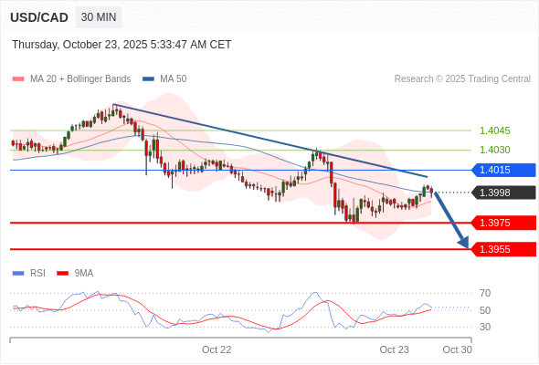 在 1.4015 之下,看跌,目标价位为 1.3975 ,然后为 1.3955 。