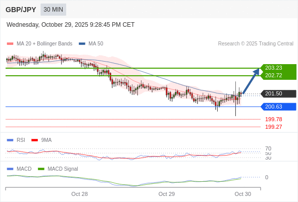 英镑/日元 当日内: 看涨,当 200.63 为支撑位。