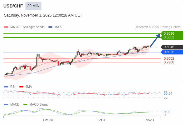 美元/瑞郎 当日内 : 看涨,当 0.8026 为支撑位。