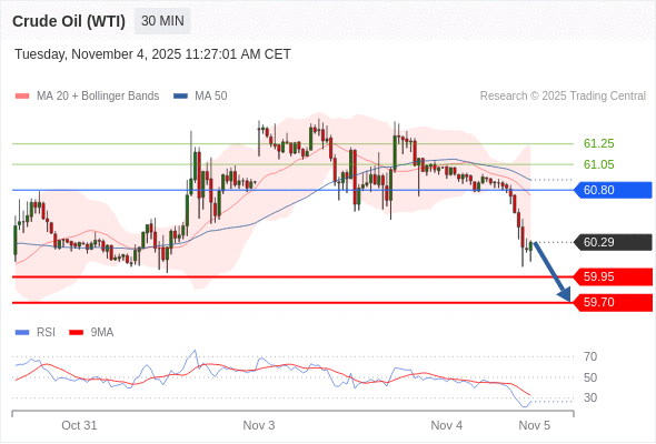 在 60.80 之下,看跌,目标价位为 59.95 ,然后为 59.70 。