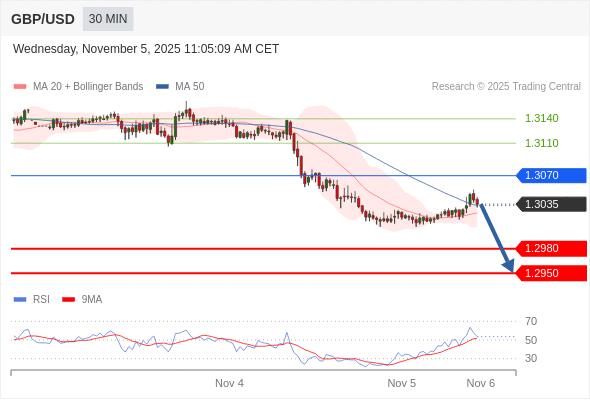 在 1.3070 之下,看跌,目标价位为 1.2980 ,然后为 1.2950 。