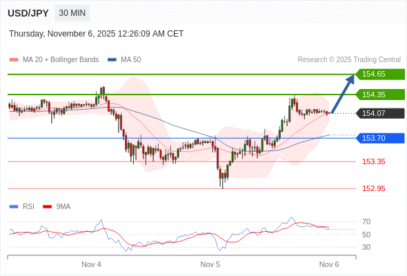 在 153.70 之上,看涨,目标价位为 154.35 ,然后为 154.65 。